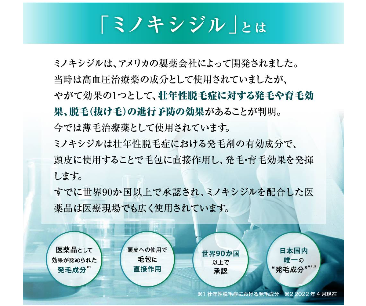 頭皮に直接塗布すると毛母細胞を刺激し細胞分裂が活発になることで、髪の成長を促進します。特に、頭頂部や生え際の薄毛に対する作用が期待されています。