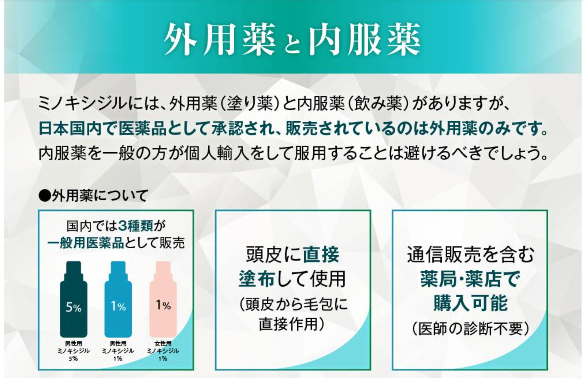 日本では、ミノキシジル含有量が5%以下の塗り薬であれば、医師の処方箋なしで薬局やドラッグストア、オンラインなどで購入できます。内服薬が医療用医薬品であり、医師の診察と処方が必須であることと比較すると、手軽に入手可能です。